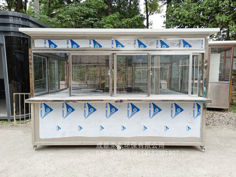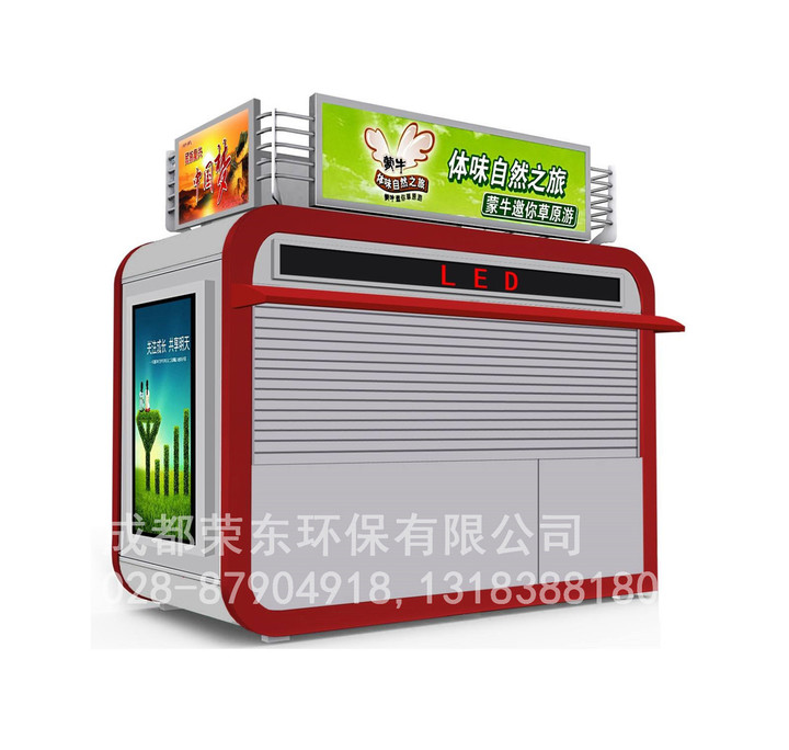 8、售货亭外顶:中间为方通架,表层为优质不锈钢板;