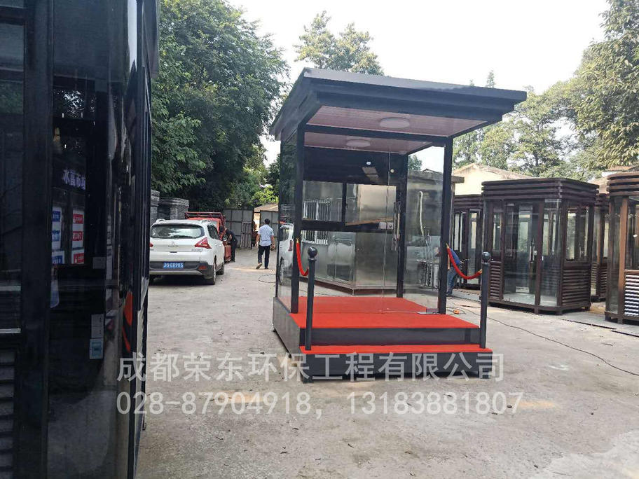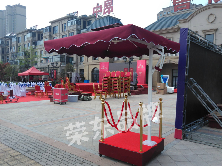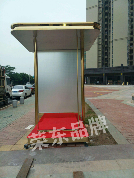 4、底座为三层,分别为镀锌钢管、防腐木、防滑铝板上面覆盖红地毯;底座四周为304不锈钢板,底部可配备滑轮,可移动