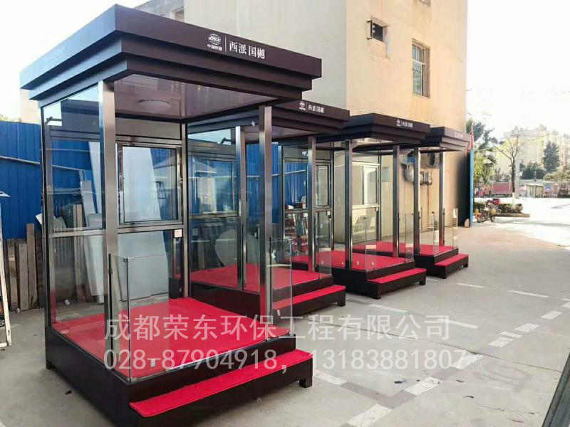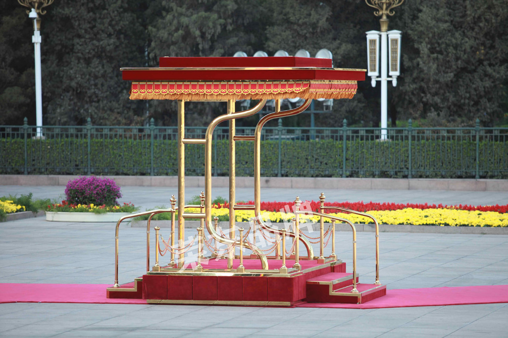 4、底座为三层,分别为镀锌钢管、防腐木、防滑铝板上面覆盖红地毯;底座四周为304不锈钢板,底部可配备滑轮,可移动